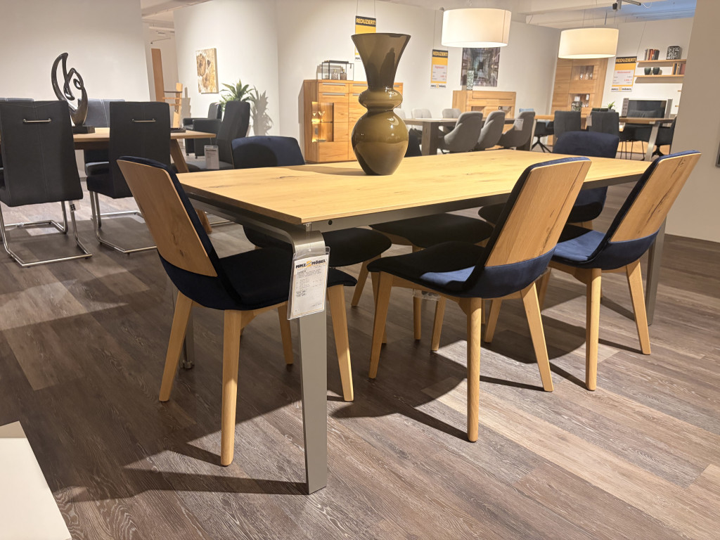 - Platte: Balkeneiche Natur- Gestell: Edelstahl Optik - Auszug einseitig 100cm- Maße (ohne Auszug): 200x95cm